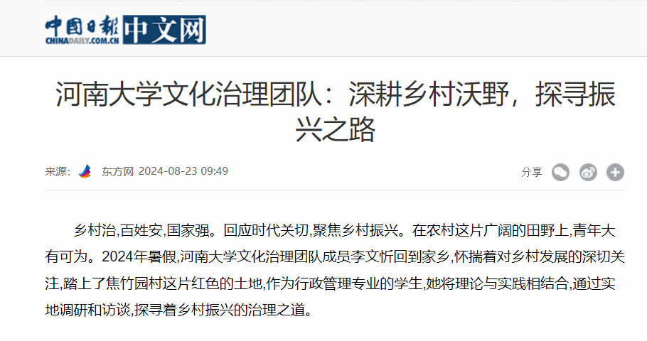 学子李文忻暑期深入河南省焦竹园村进行调研的事迹被《中国日报》报道,此次调研不仅体现了学生做爱影片
