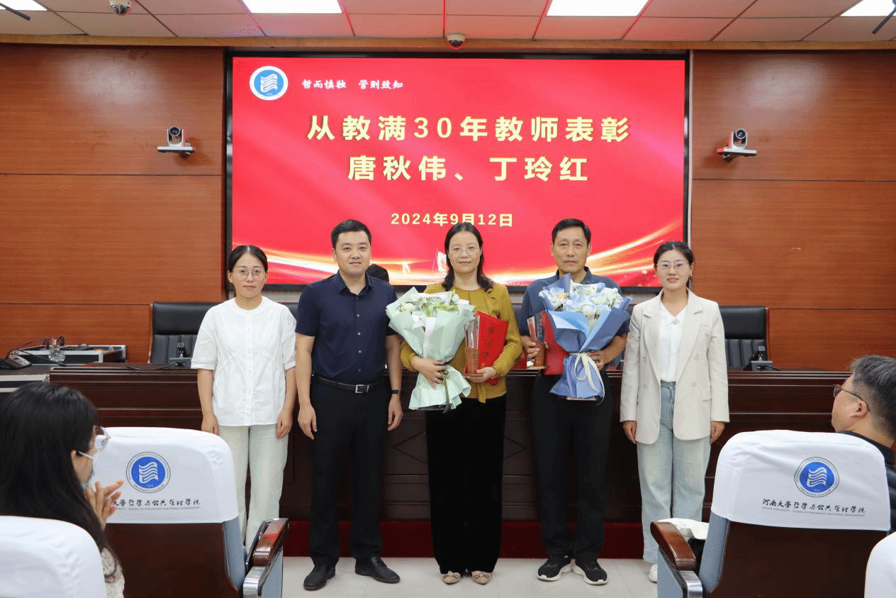 “最美教师”田丰韶以及从教满30年教龄的唐秋伟、丁玲红老师奉上鲜花,院长姬志闯为唐秋伟、丁玲红二位教师颁发从教满30年证书和奖杯。
