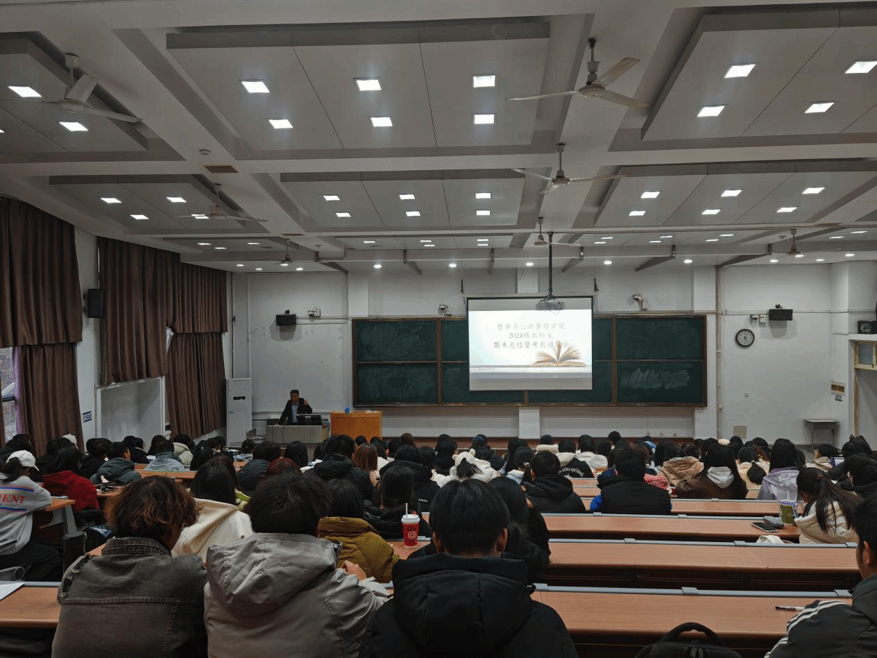 副院长刘辉的谆谆教诲中拉开帷幕。他首先对大一新生在本学期的整体表现给予了充分肯定,指出同学们在各个方面都取得了长足进步。同时,强调了期末考试对学习成果检验的重要性,鼓励同学们要树立诚信观念,以积极的心理状态和扎实的知识储备去应对挑战。随后,本科生辅导员李蓓对同学们提出了殷切期望。她表示大一新生要积极向各科老师请教,不断增长自身知识与经验、提高学习的效率和效力,在成长的道路上行稳致远;其次,身为大学生要始终与时代同频共振,摆正自身位置,不断求索进步,谱写哲管学子最靓丽的青春篇章。最后,朋辈辅导员李子玉就考试安排、考前准备、考场规则、违纪处理和假期安排五个方面进行了全面而细致地讲解。