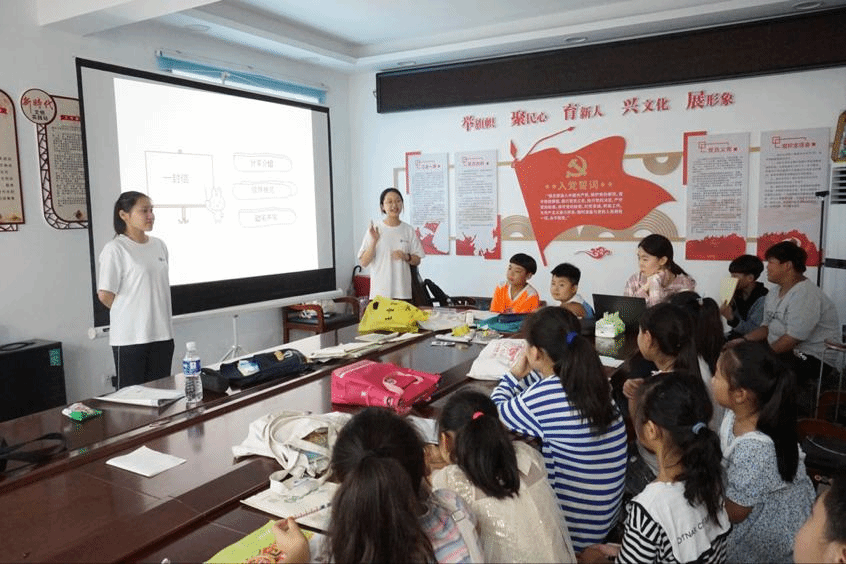 “大家好,我叫——嗯——呃——,我叫王鑫鹏,我今年8岁了,上小学二年级。”7月21日,见面会暨开班仪式正式举行,实践团借助互动游戏,通过自我介绍等系列活动,与初次见面的留守儿童拉近距离,建立起沟通的桥梁。在支教过程中,团队采取室内与室外、求知与益趣相结合的方法,引导孩子们树立正确的职业理想、政治理想、社会理想、道德理想,用知识讲堂拓宽孩子们的视野,助力儿童全方位发展。