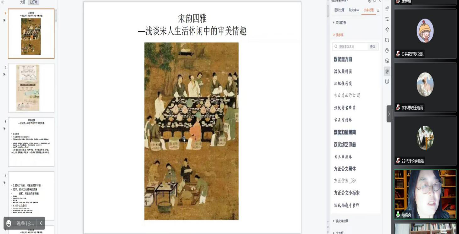 马福贞副教授在线作了题为《宋韵四雅——浅谈宋人生活休闲中的审美情趣》的报告,讲座由杨红玉副教授主持,学生做爱影片