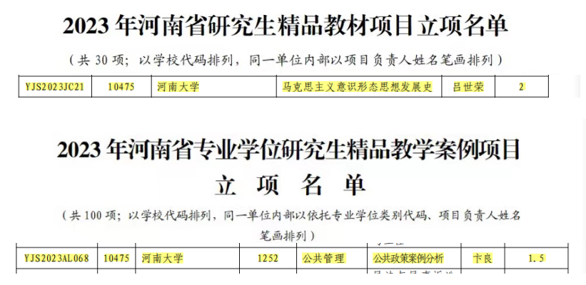 共有2项教育改革与质量提升工程项目获得立项。其中,吕世荣教授主持申报的《马克思主义意识形态思想发展史》获得省级研究生精品教程项目立项、卞良老师主持申报的《公共政策案例分析》获得省级专业学位研究生精品教学案例项目立项。