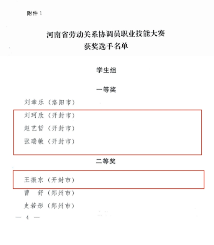 河南省劳动关系协调员职业技能大赛是由河南省人力资源和社会保障厅主办的省级行业一类赛,旨在弘扬工匠精神、培育劳动关系协调高技能人才。大赛分为职工组和学生组,试题按照国家职业技能标准命制,涉及劳动与社会保障专业知识以及我国劳动保障法律体系。自2022年9月大赛启动以来,共有近1000名选手报名参加比赛。经过省辖市选拔赛和全省决赛二个阶段,共有8名选手获省级一等奖(职工组和学生组各4名),12名选手获省级二等奖(职工组和学生组各6名),20名选手获省级三等奖。