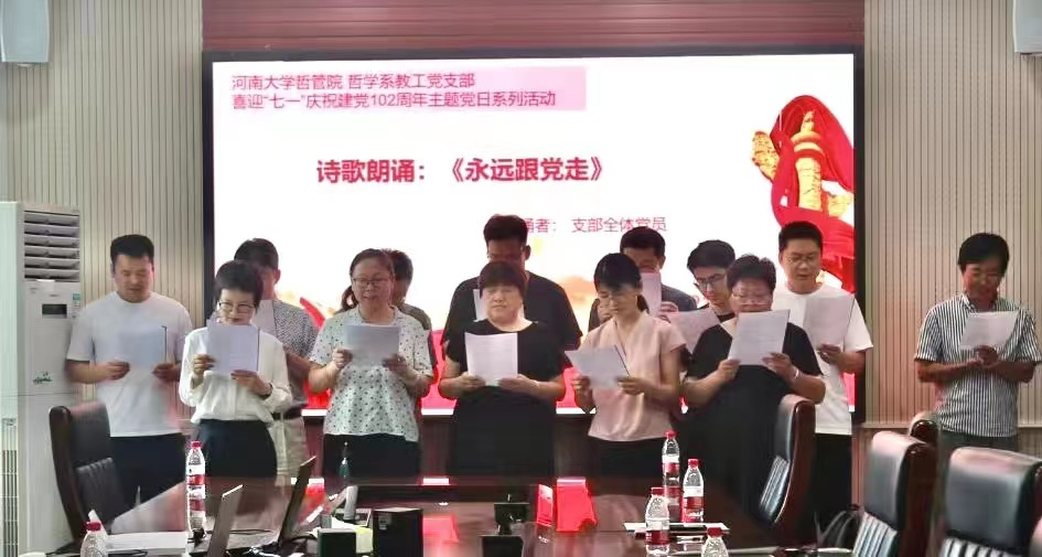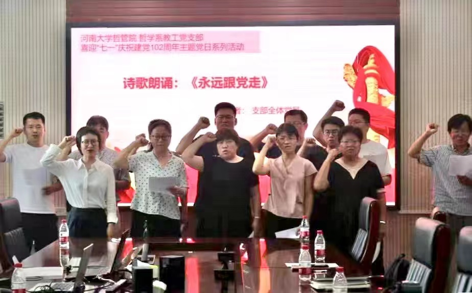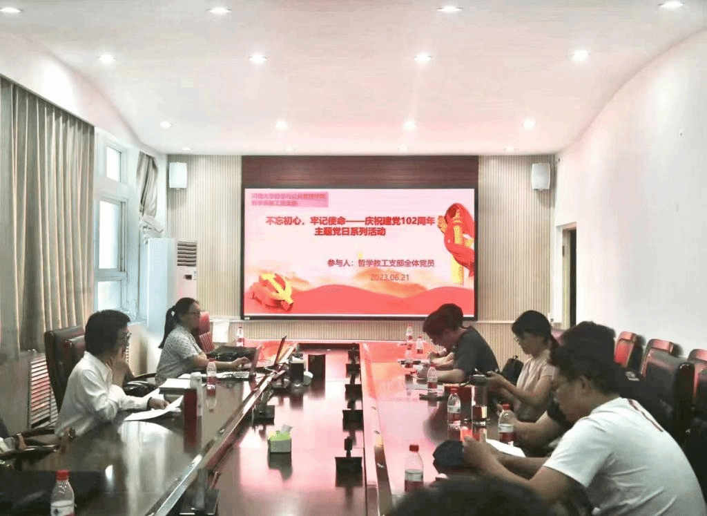 第二会议室开展了“不忘初心,牢记使命——庆祝建党102周年”主题党日活动。按照“学思想、强党性、重实践、建新功”的总要求,积极引导支部党员在习近平新时代中国特色社会主义思想指导下,践行初心,勇担使命。哲学系教工党支部全体党员参与了此次活动,活动由党支部书记焦卫华主持。