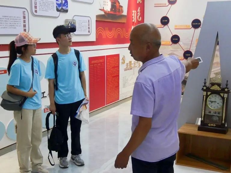 ——图为王万才带领实践队成员参观村史馆——