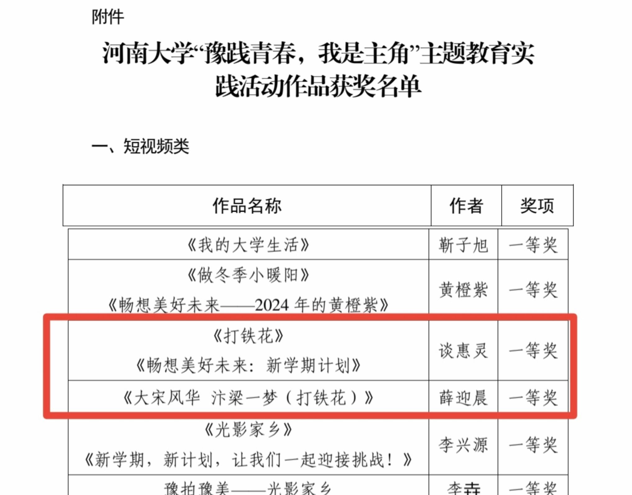 “豫践青春,我是主角”主题教育实践活动获奖作品的通知。全校共评选出短视频类一等奖作品21件、二等奖作品5件、三等奖作品7件;图文类一等奖作品15件、二等奖作品12件、三等奖作品12件。