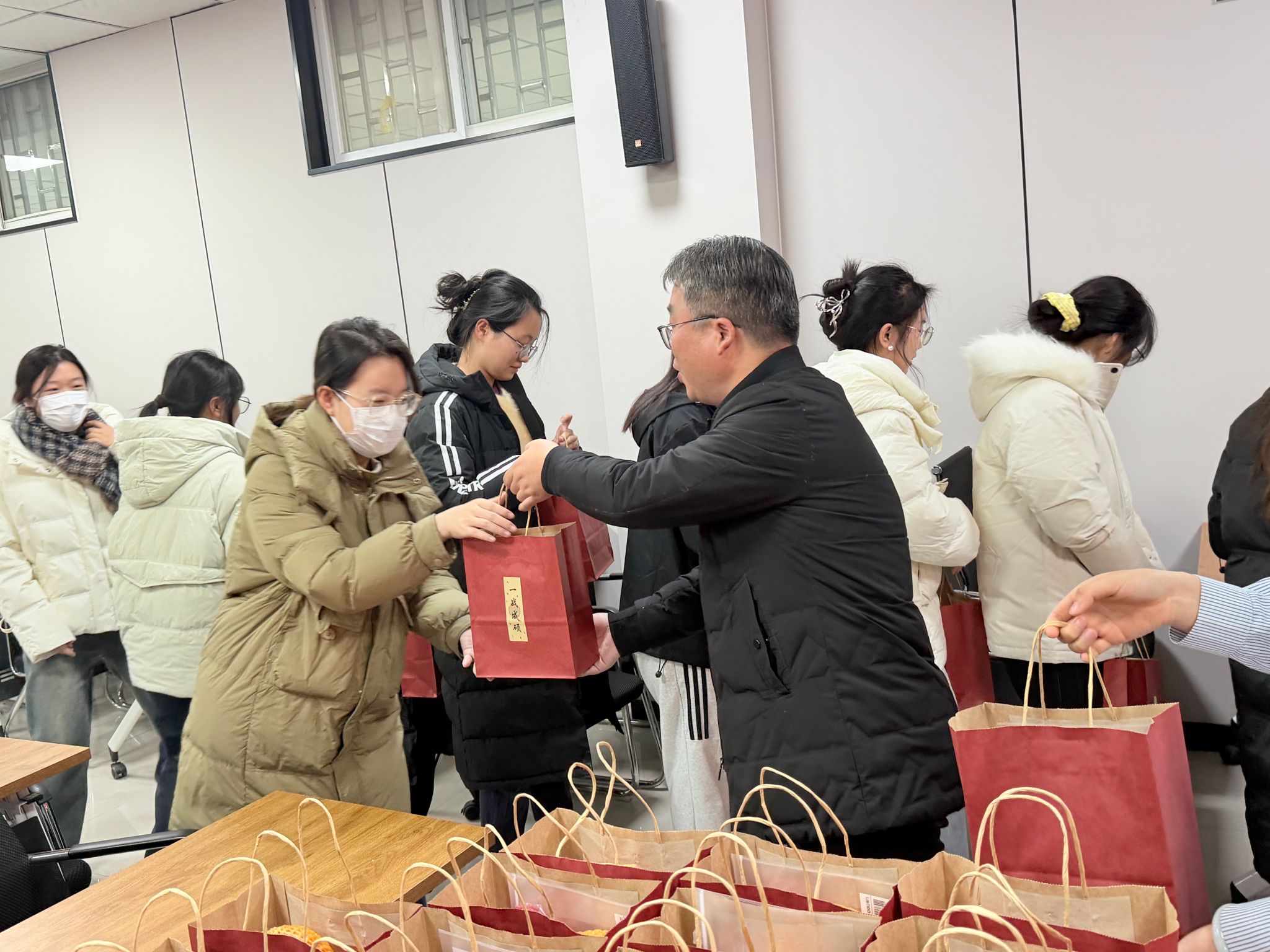 随后,参会领导和老师向考研学子送去祝福并发放“温暖礼包”,鼓励大家坚守初心,以定力、耐力、魄力迎接人生的重要考场。福袋玲珑,情谊深长:饱含甜蜜的苹果与糖果寓意“苹”安顺遂,为奋斗时光注入能量与温暖;向日葵钥匙扣寓意“一举夺魁”的,承载着对学子旗开得胜的美好祝愿。学子们接过这份心意满满的祝福,惊喜与感动溢于言表,纷纷表示将带着学生做爱影片 的殷切期盼,在考研征程中坚定前行。
